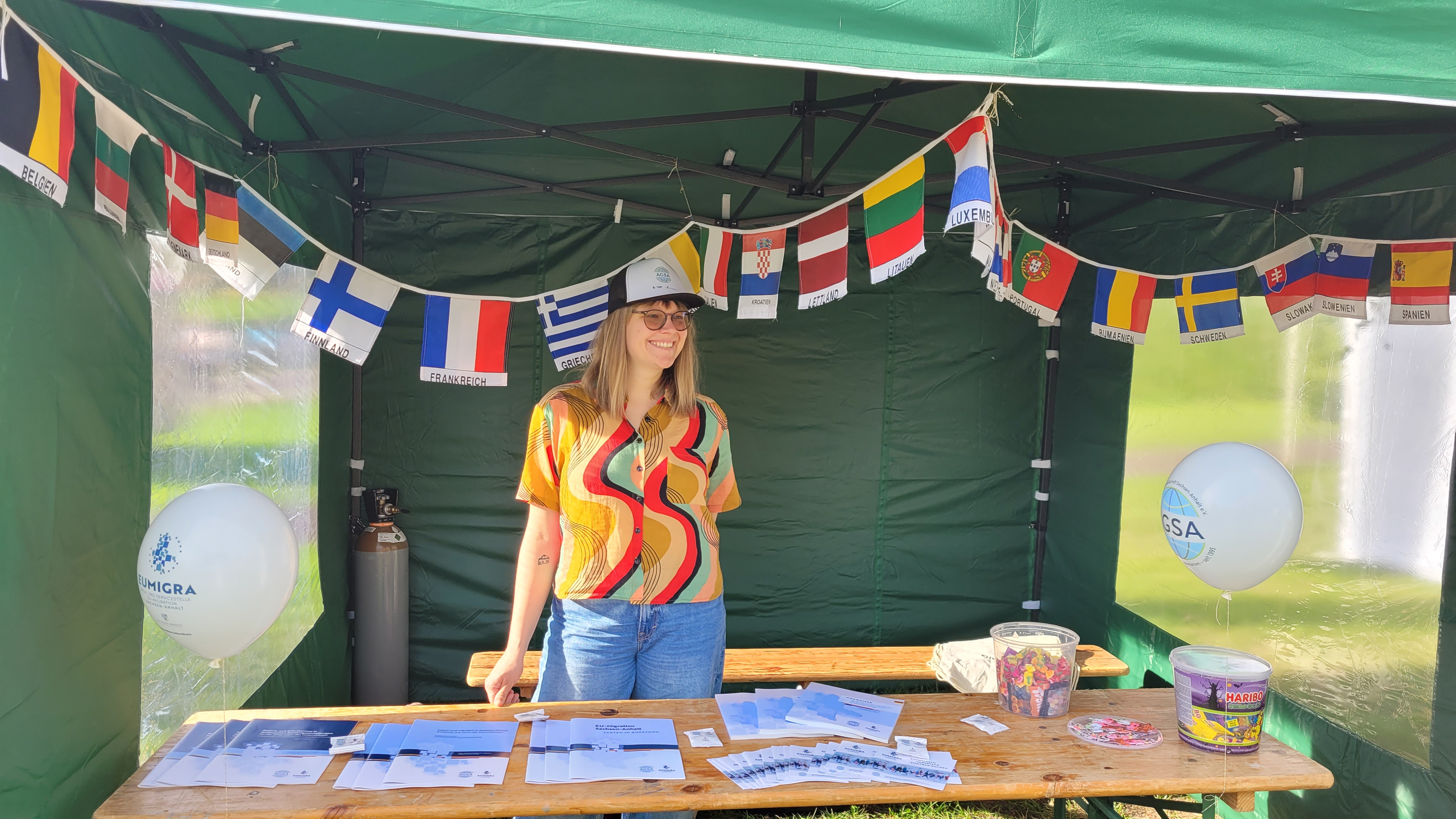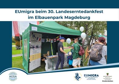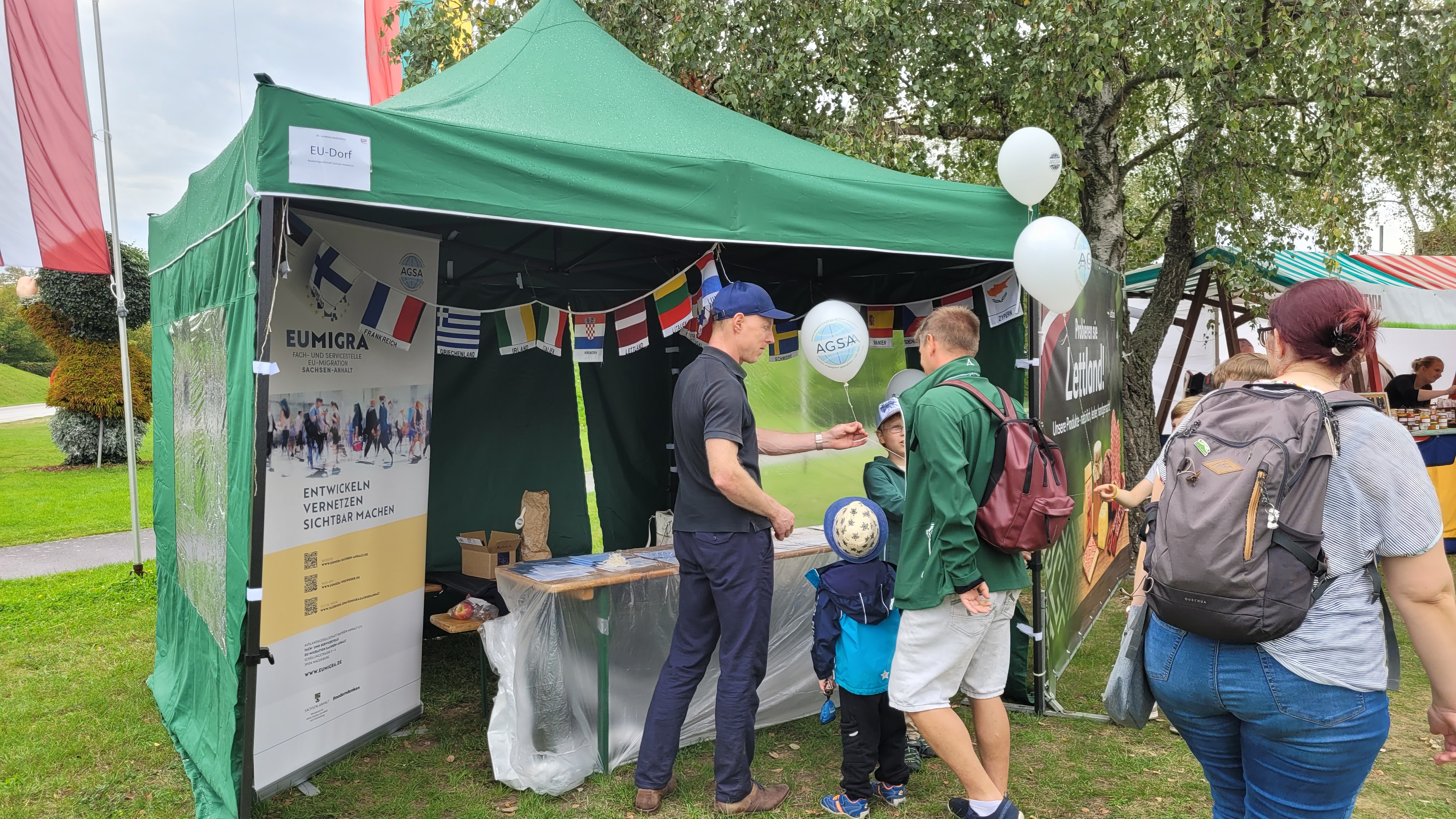 Mitten im Geschehen: die Auslandsgesellschaft Sachsen-Anhalt e. V. (AGSA) mit ihrem Landesprojekt EUmigra – Fach- und Servicestelle EU-Migration Sachsen-Anhalt Das Team informierte vor Ort zu Themen der EU-Freizügigkeit, zur Arbeitsmigration und zu Beratungsangeboten für EU-Bürgerinnen und -bürger in Sachsen-Anhalt. Zahlreiche Gespräche mit Besucherinnen und Besuchern zeigten das anhaltende Interesse an Fragen von Mobilität, Arbeitsmarktintegration und sozialer Teilhabe.