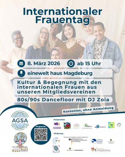 Anlässlich des Internationalen Frauentags lädt die Auslandsgesellschaft Sachsen-Anhalt (AGSA) am Sonntag, 8. März, ab 15 Uhr zur traditionellen Frauentagsveranstaltung ins einewelt haus Magdeburg ein. Die Feier findet im Rahmen der Magdeburger Frauenaktionstage statt.